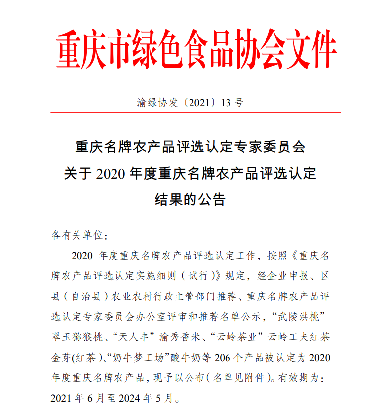 重慶市綠色食品協會依據《重慶名牌農產品評選認定實施細則(試行)》,精心組織,嚴格評選,2020年度重慶名牌農產品評選結果於2021年6月1日正式公布,康諾百草的產品羊肚菌入選此次年度重慶名牌農產品名單。