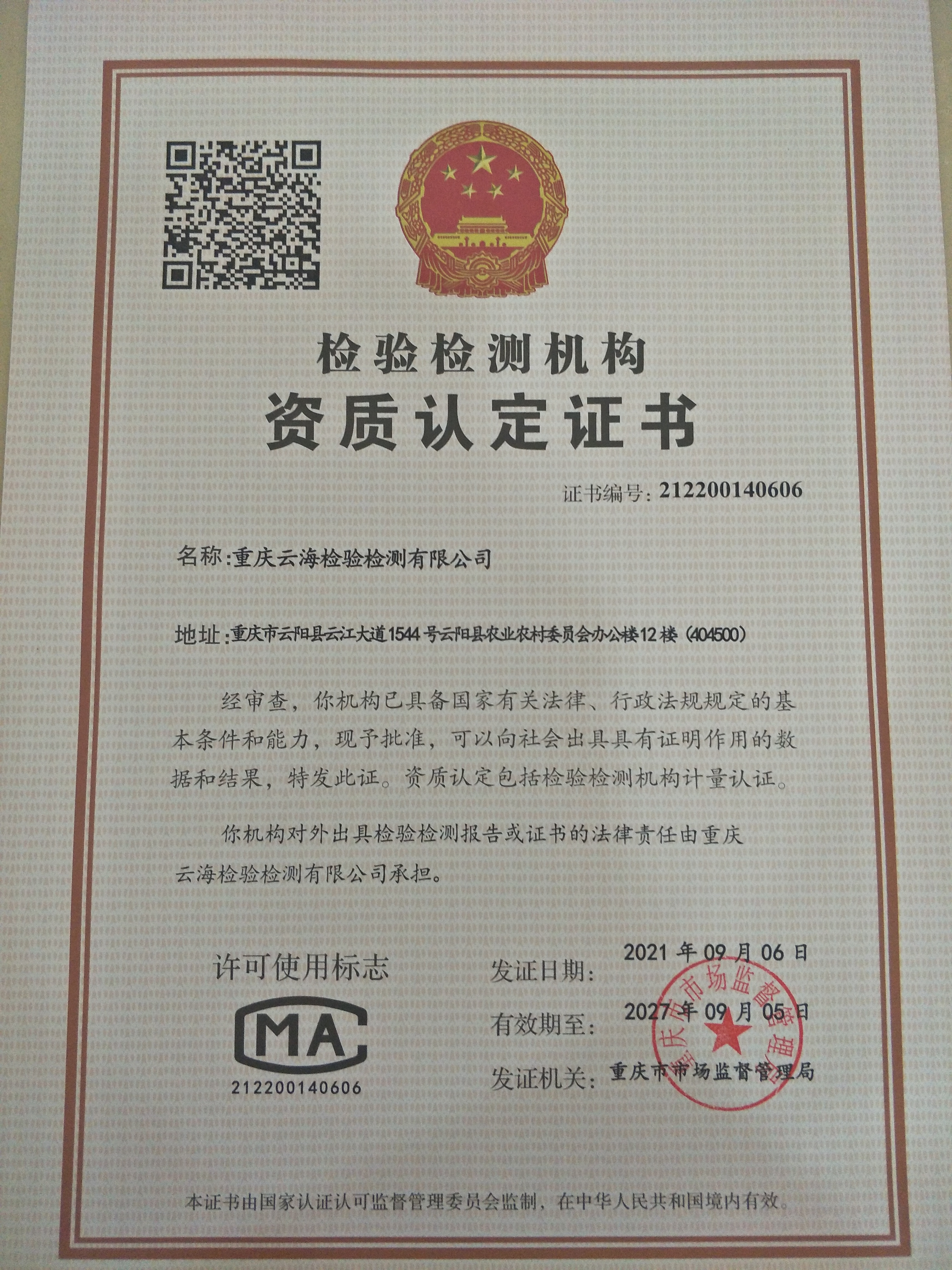 熱烈祝賀重慶雲海檢驗檢測有限公司首次取得CMA認定證書