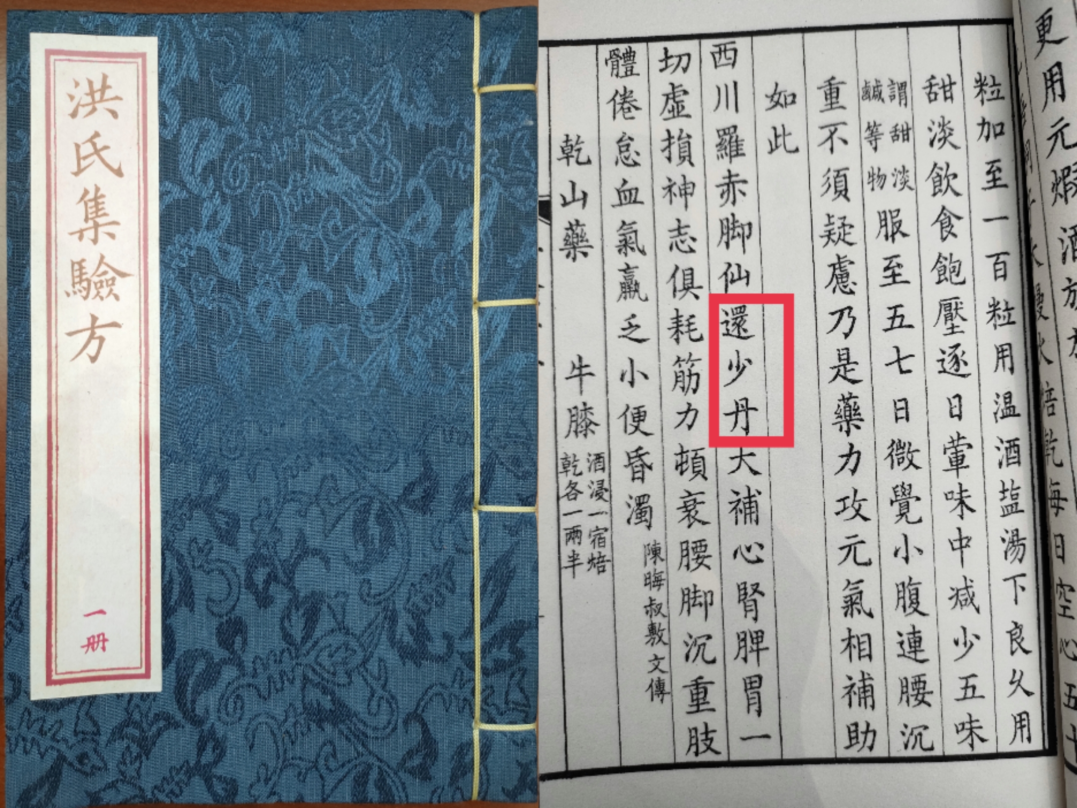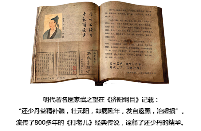 《中醫古方名考》稱還少丹,“ 所謂返老還少之丹藥,中醫鮮有不識者”。明朝《濟陽綱目》記載:“益精補髓、壯元陽、去病延年、白發反黑。主虛損。”