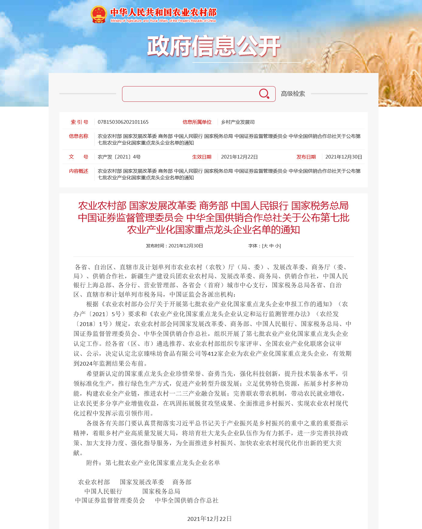 12月22日,農業農村部會同國家發展改革委、商務部、中國人民銀行、國家稅務總局、中國證券監督管理委員會、中華全國供銷合作總社發布《農業農村部 國家發展改革委 商務部 中國人民銀行 國家稅務總局 中國證券監督管理委員會 中華全國供銷合作總社關於公布第七批農業產業化國家重點龍頭企業名單的通知》(農產發〔2021〕4號),經各省(區、市)遴選推薦、農業農村部組織專家評審、全國農業產業化聯席會議審議、公示,決定認定412家企業為農業產業化國家重點龍頭企業,重慶三峽雲海藥業股份有限公司榜上有名。